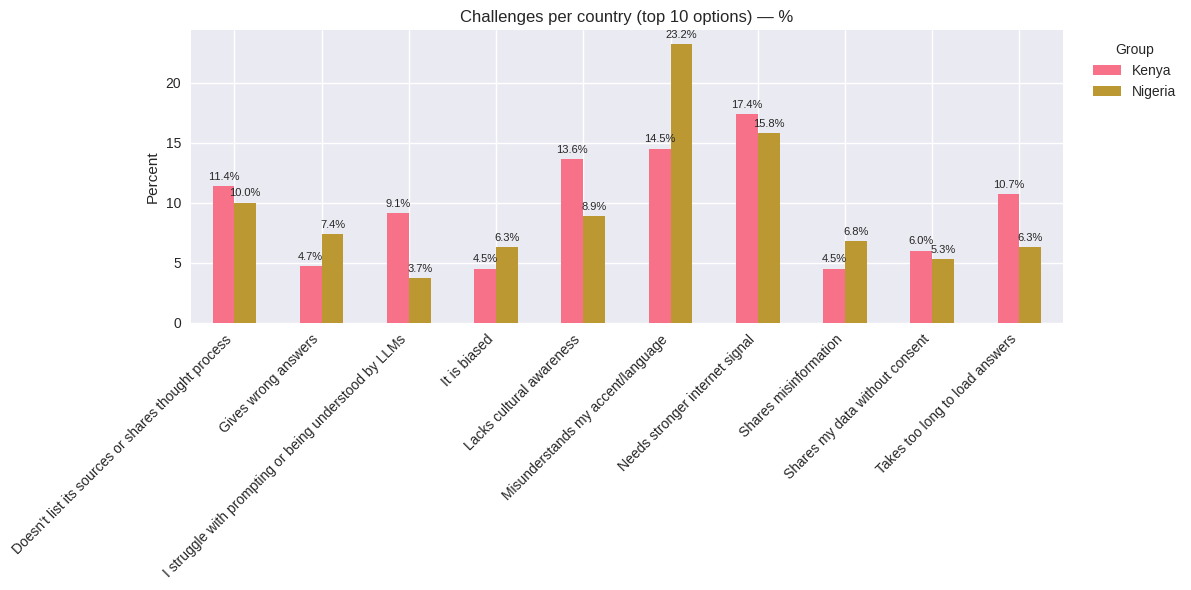 Taking a closer look (country-view) at the top 10 challenges people have with using AI, the top challenges across both countries are: misunderstands accents/languages and needing a stronger internet connection. The challenge of AI misunderstanding accents/languages is more prevalent in Nigeria than in Kenya, and looking back at the preference for text over voice chat with AI, we wonder how much of a role this plays. Interestingly, the challenges of AI lacking cultural awareness, taking too long to load answers and struggling with prompting are more prevalent in Kenya. Naturally, our initial theory on why AI lacking cultural awareness is a more pronounced problem in Kenya than in Nigeria is ascribing it to the difference in these countries' population and the disparity in the volume of user-generated content freely available on the internet these models train on.