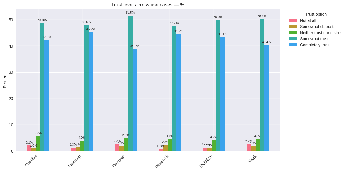 Across all use cases we explored, at least 90% of people either somewhat or completely trust AI for personal, business, learning and educational, technical assistance and troubleshooting, and research and decision-making needs.