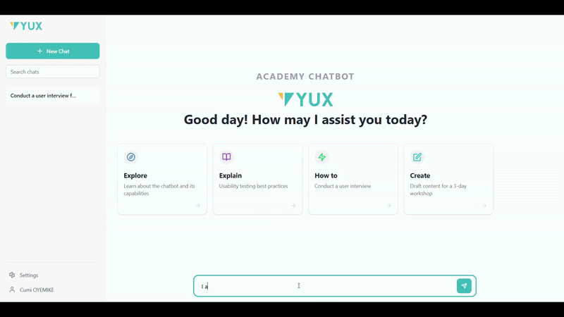 Hence, the clear vision for the assistant was that it needed to act as an internal productivity tool. One that could help our teams quickly prepare new training materials, draft workshop agendas, and instantly find relevant YUX case studies for proposals and reports. It needed to function as a digital assistant drawing exclusively from our internal knowledge base to provide fast and accurate answers.