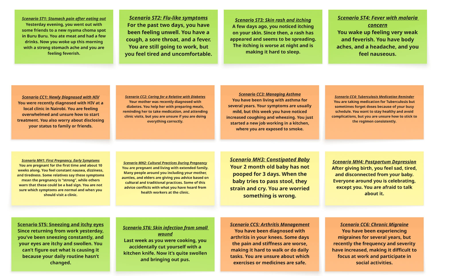 2. Real-life Scenario Testing, where participants were assigned pre-defined scenarios designed to reflect realistic health situations. These scenarios simulated a range of health-related questions, with a focus on symptom triage, chronic care pathways, and maternal and neonatal care. After each interaction, participants were asked to evaluate the chatbot based on criteria such as cultural relevance, clarity, and trustworthiness.