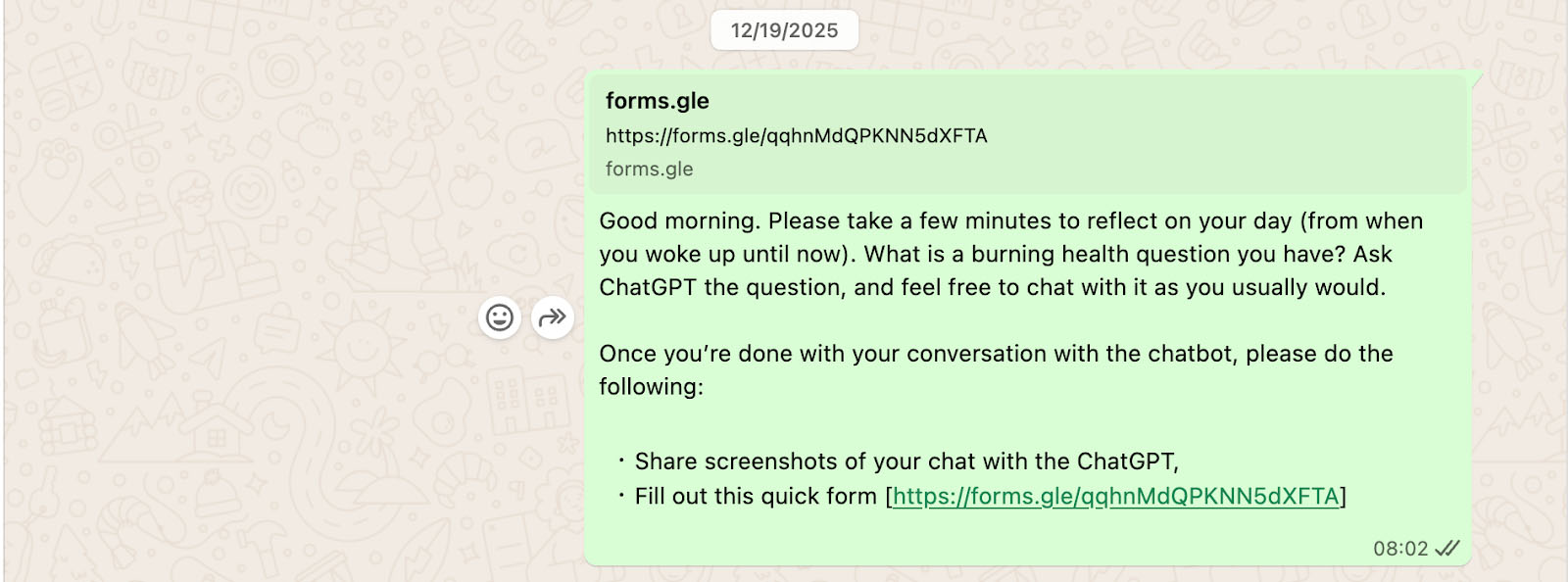 The large-scale, mixed-methods, diary-based survey was designed to capture a high-fidelity snapshot of how individuals integrate Large Language Models (LLMs) into their daily health management. By utilising a diary study format, the research aimed to move beyond theoretical sentiment and into the "lived experience" of the participants. The participants were pinged twice daily on WhatsApp with an open-ended question: “what is a burning health question you have? Ask the chatbot the question, and feel free to chat with it as you usually would.” The survey questions that followed, along with the main question, were designed to uncover the specific nature of unprompted health queries, the resonance of AI-generated advice, and the friction points at which guidance fails or leads to misunderstandings.