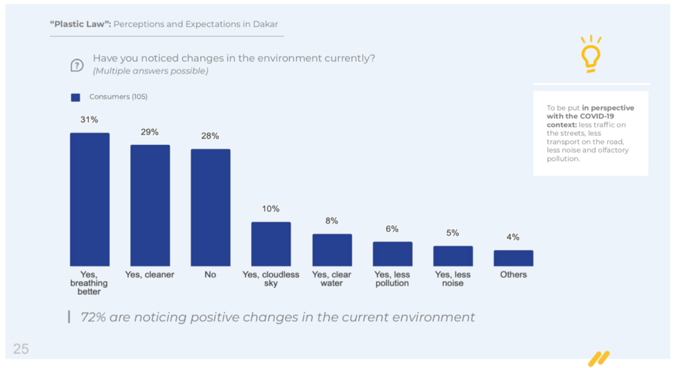 Respondents express their perceptions and expectations of the law n°2020–04 of January 8th, 2020, commonly known as the “Plastic law”, which aims to prevent and reduce the environmental impact of plastic in Senegal and inscribes itself in the national “Zero Waste” program of the Senegalese government.