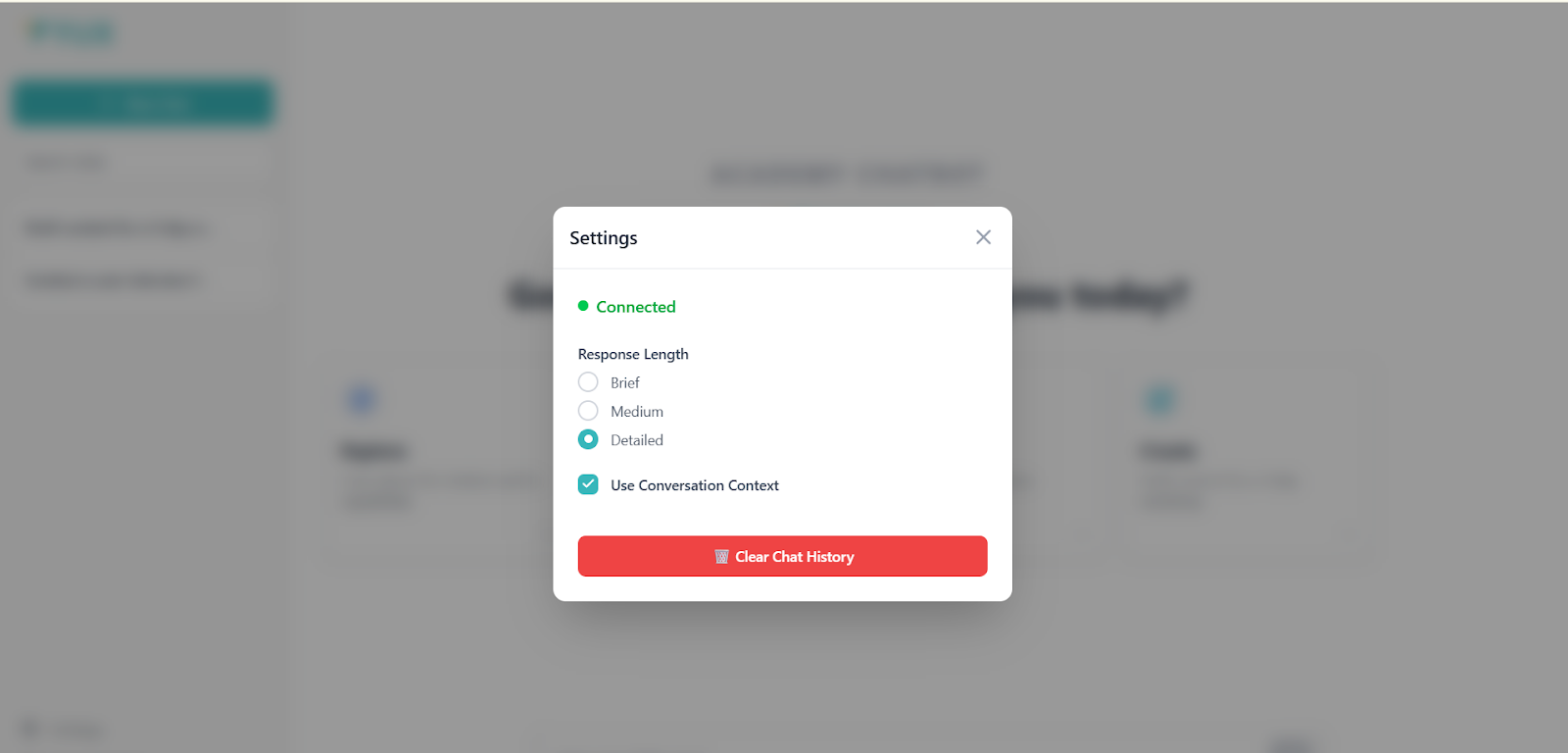 For the Frontend, we built a user interface using React and TypeScript, prioritising user experience from the ground up. The interface features real-time response streaming with a “Stop Generating” option, a clean welcome screen with prompt starters to guide users, and a comprehensive settings panel that allows users to control response length, toggle conversational context, and manage their chat history. Authentication flows through Firebase with Google Sign-In, providing both security and convenience.
