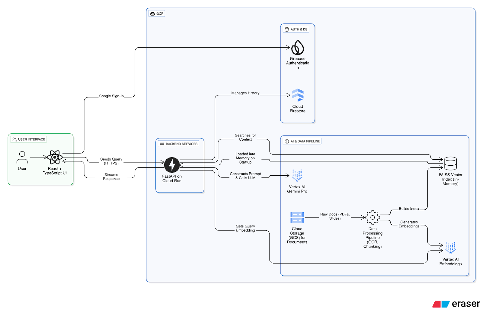 Query processing follows a structured workflow. When a user submits a query through the React frontend, Firebase Authentication validates the request via ID token, then the FastAPI backend embeds the query using the same embedding model and performs FAISS similarity search to retrieve the most relevant document chunks. A detailed prompt is constructed combining the system message, retrieved context, conversation history from Firestore, the user’s query, and response length instructions, which is sent to Google’s Gemini 2.5-Pro model via Vertex AI. The model streams its response token-by-token to the frontend while both the query and response are persisted to Firestore for conversation continuity.