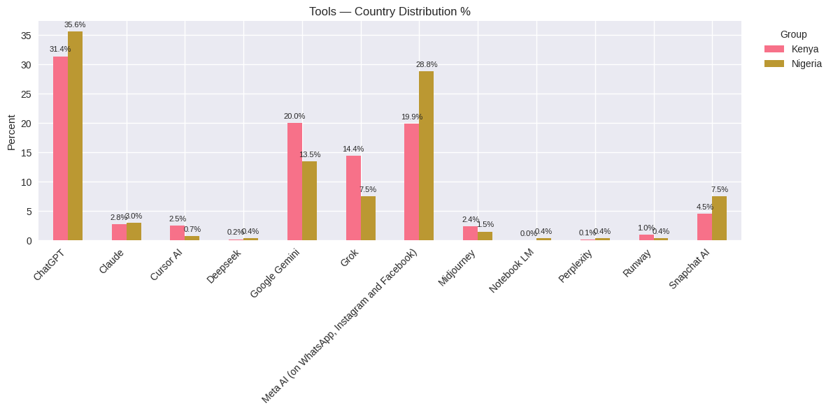 Taking a more country-specific view of the use of AI tools, we observed that people in Kenya are twice as likely to use Grok as people in Nigeria. Kenya also has more (relative to the total number of responses from the country) people using Google Gemini. Nigeria, on the other hand, has more people (relative to the total number of responses from the country) using ChatGPT, Meta AI and Snapchat AI.