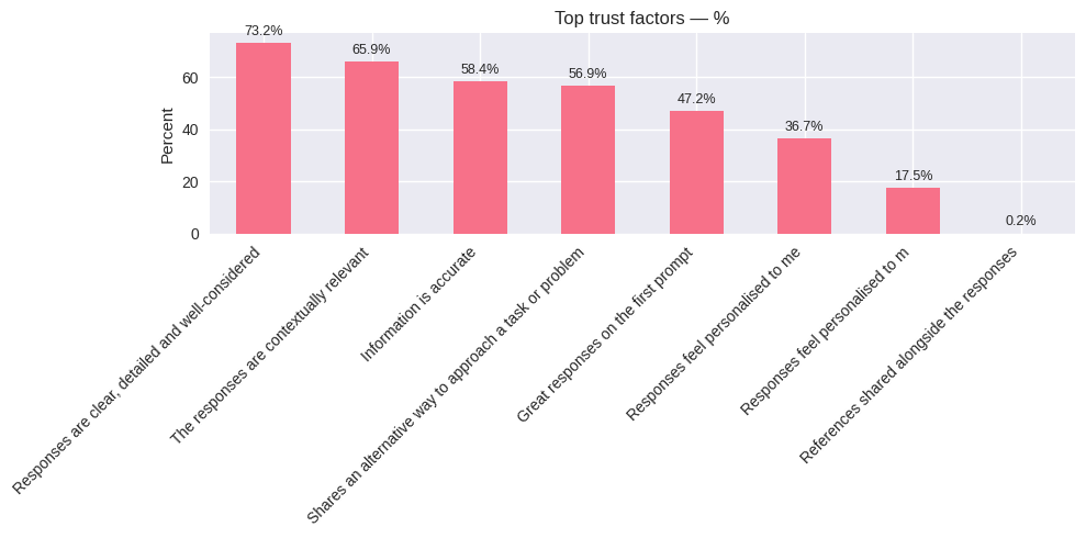 Across all use cases we explored, at least 90% of people either somewhat or completely trust AI for personal, business, learning and educational, technical assistance and troubleshooting, and research and decision-making needs.